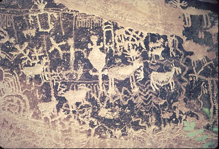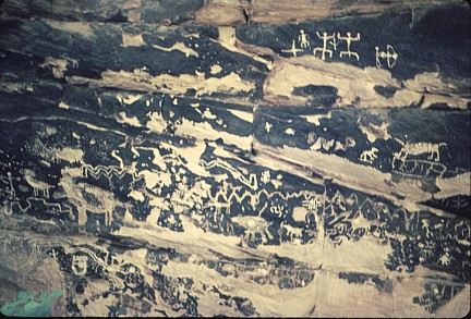 ![]() June 9-11, 1972 Unfortunately, a large portion of the petroglyphs were visually ruined by some dimwitted stupid morons[1] who built a fire directly under them. Fortunately, the cultural "data" are still there since the figures are created by pecking at the soft Coconino sandstone with a harder rock. Notice another small locust on the far left which does not appear in the 2007 photo. |