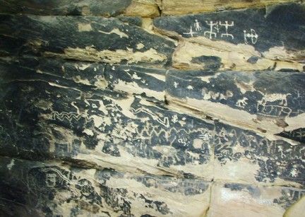 May 24, 2007 Twenty-five years later the locust has hardly grown at all. Not surprisingly, since it is well under the overhanging cliff and receives little direct precipitation. It is also heavily shaded by the cliff and surrounding coniferous trees. It is very good to see that the droves of people who have visited these carvings since 1972 have had little or no effect on this group of carvings. |