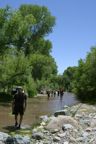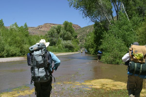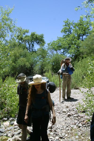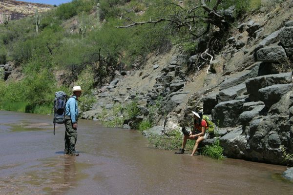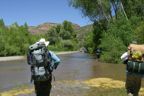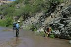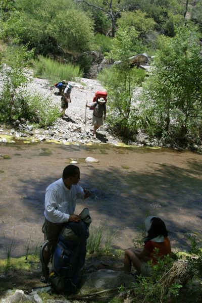 ![]() Michael & Dari rearrange their packs as Kevin & Brian prepare to ford the mighty Aravaipa. God help them! |