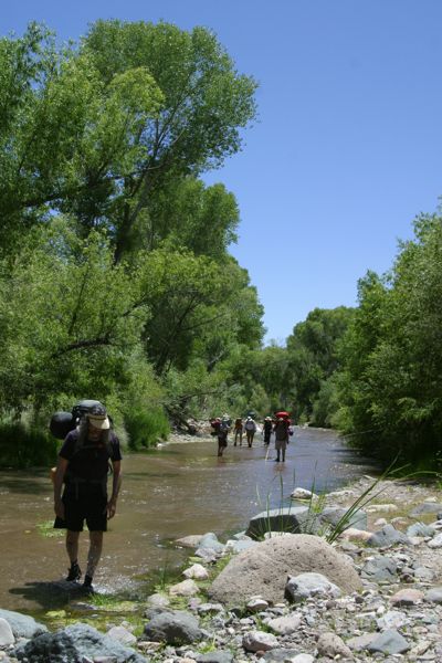 ![]() Having only just survived the first crossing, Brian (foreground), Kevin (red pack) and the others 'slog the creek.' |